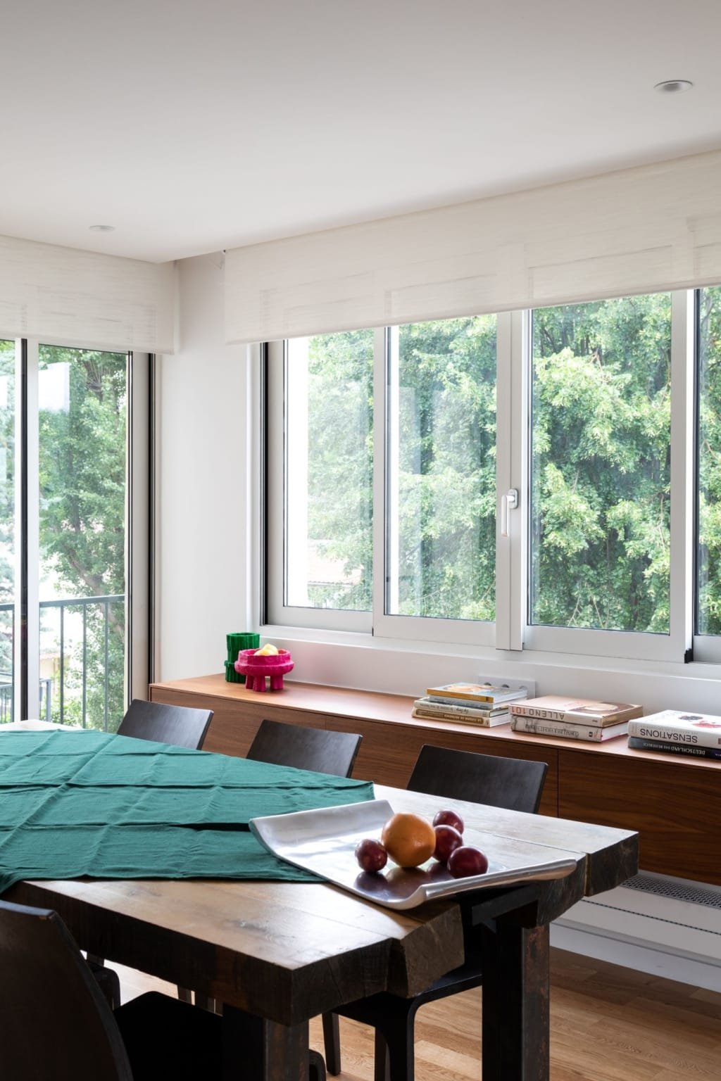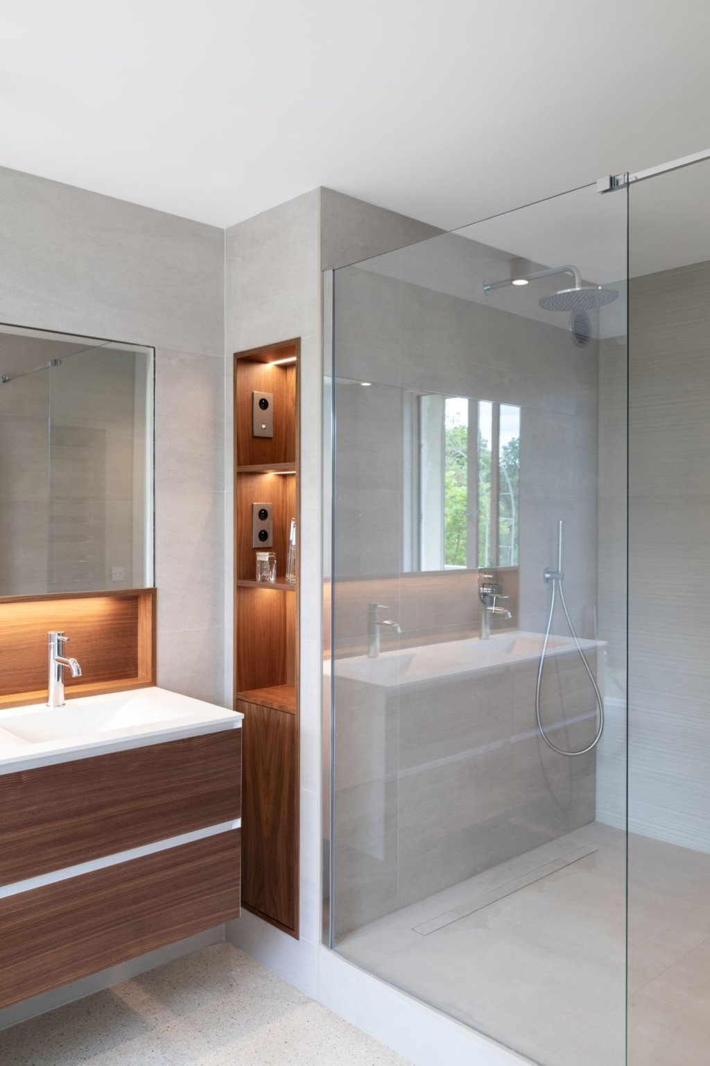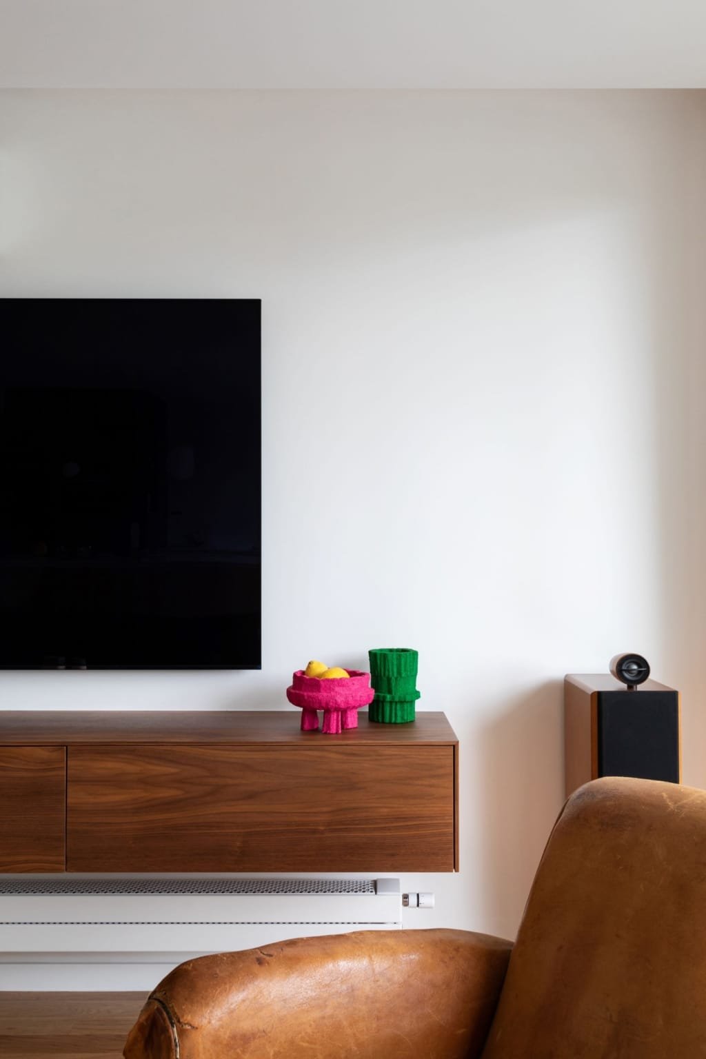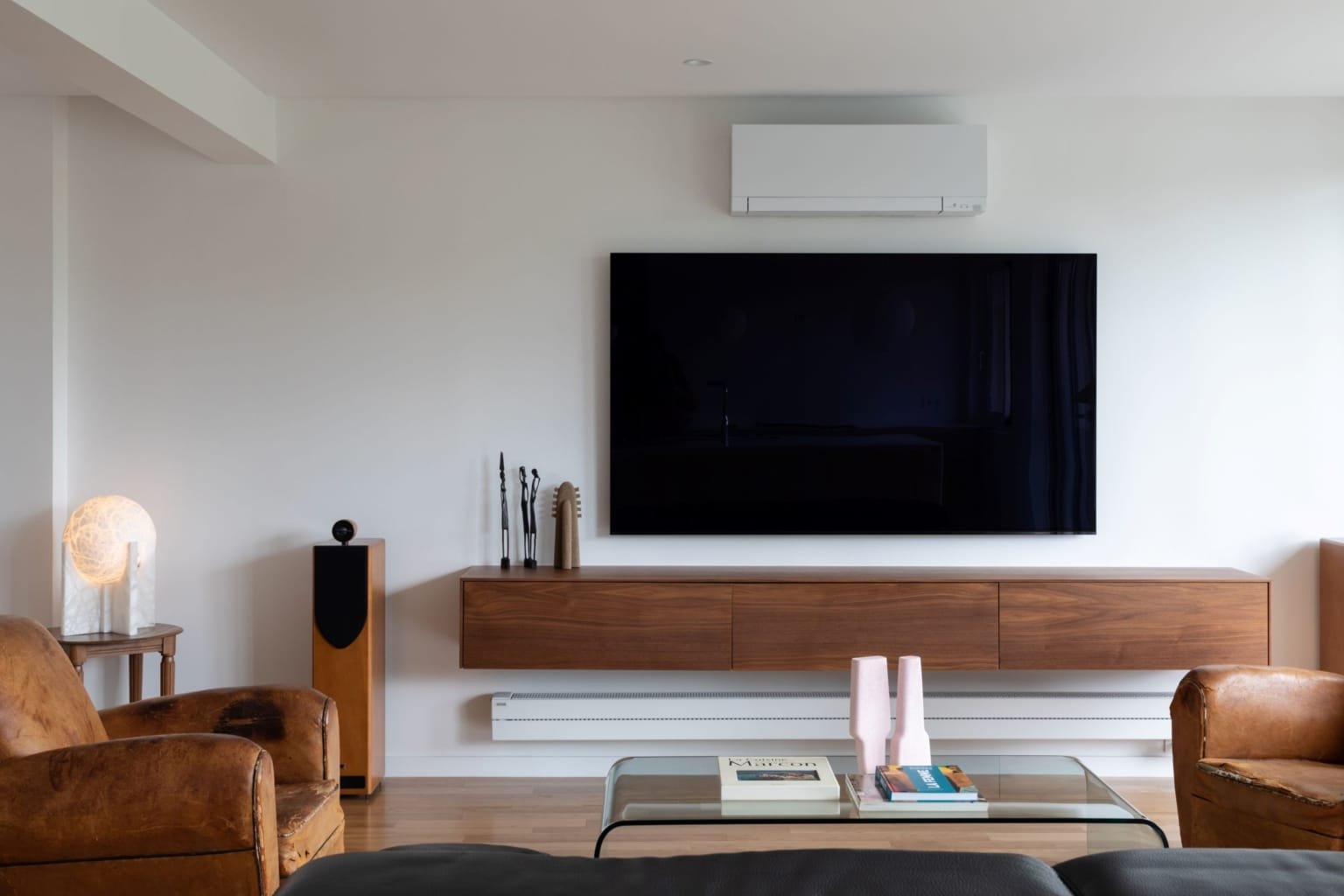 Un et un ne font qu’un. Né de la réunion de deux appartements modernistes, ce duplex tout en volumes se caractérise par son allure épuré. On y entre au second par la pièce de vie ; un plan libre offrant la meilleure vue sur la Marne. Un escalier central descend dans le prolongement de l’îlot pour distribuer les pièces de nuit tout en intimité. Grâce à cette transformation, Marie et Luc gardent leur adresse idyllique sur les bords de Marne et savourent tout le confort d’un appartement résolument contemporain à la pointe de la technologie.