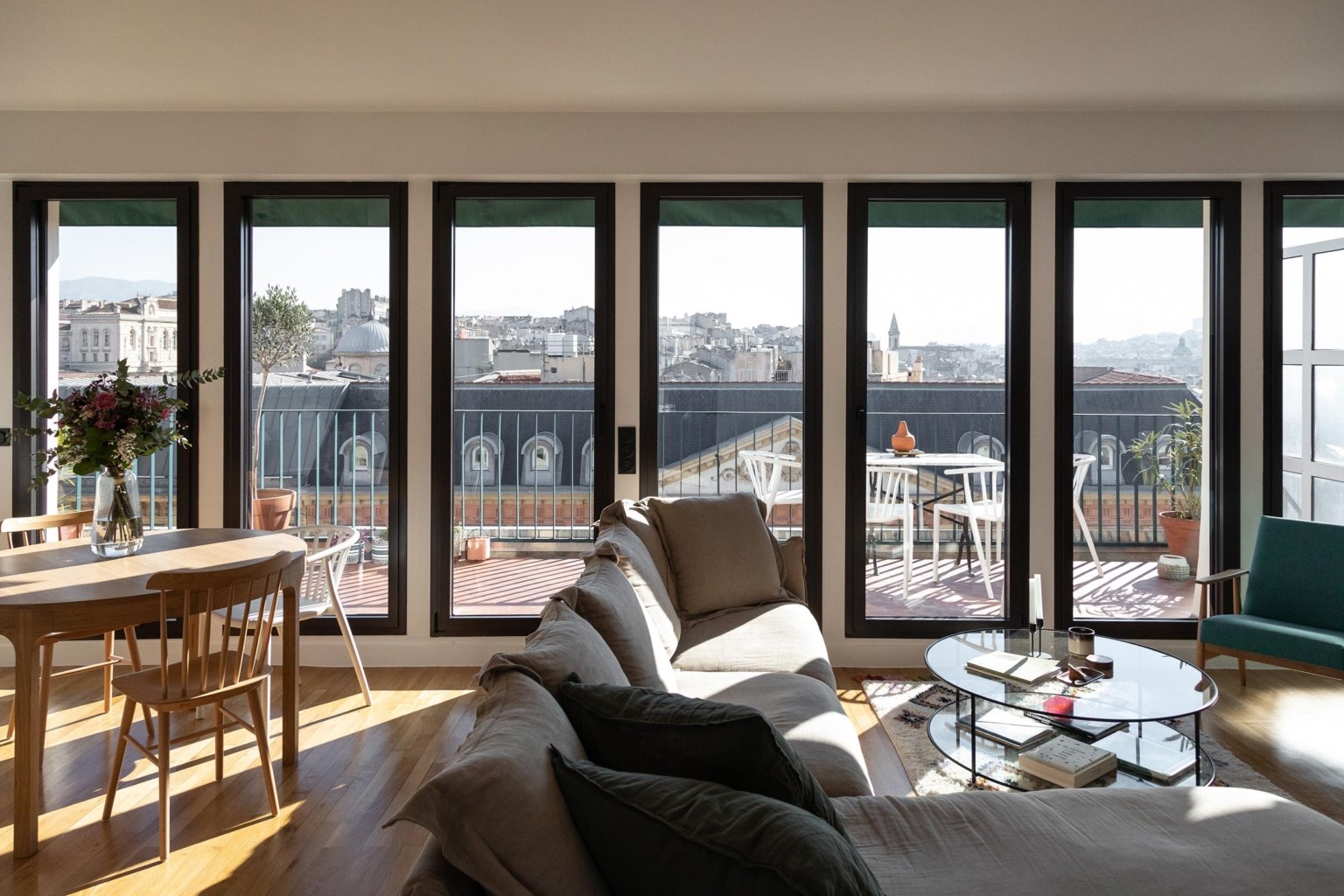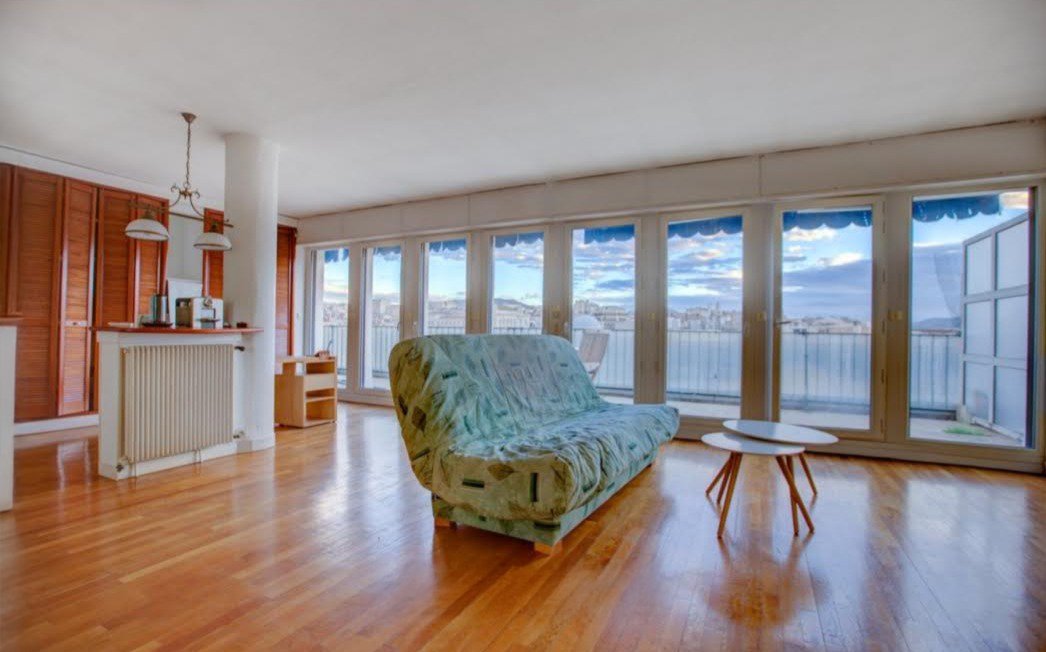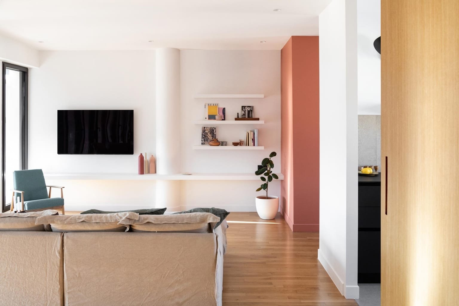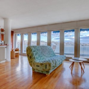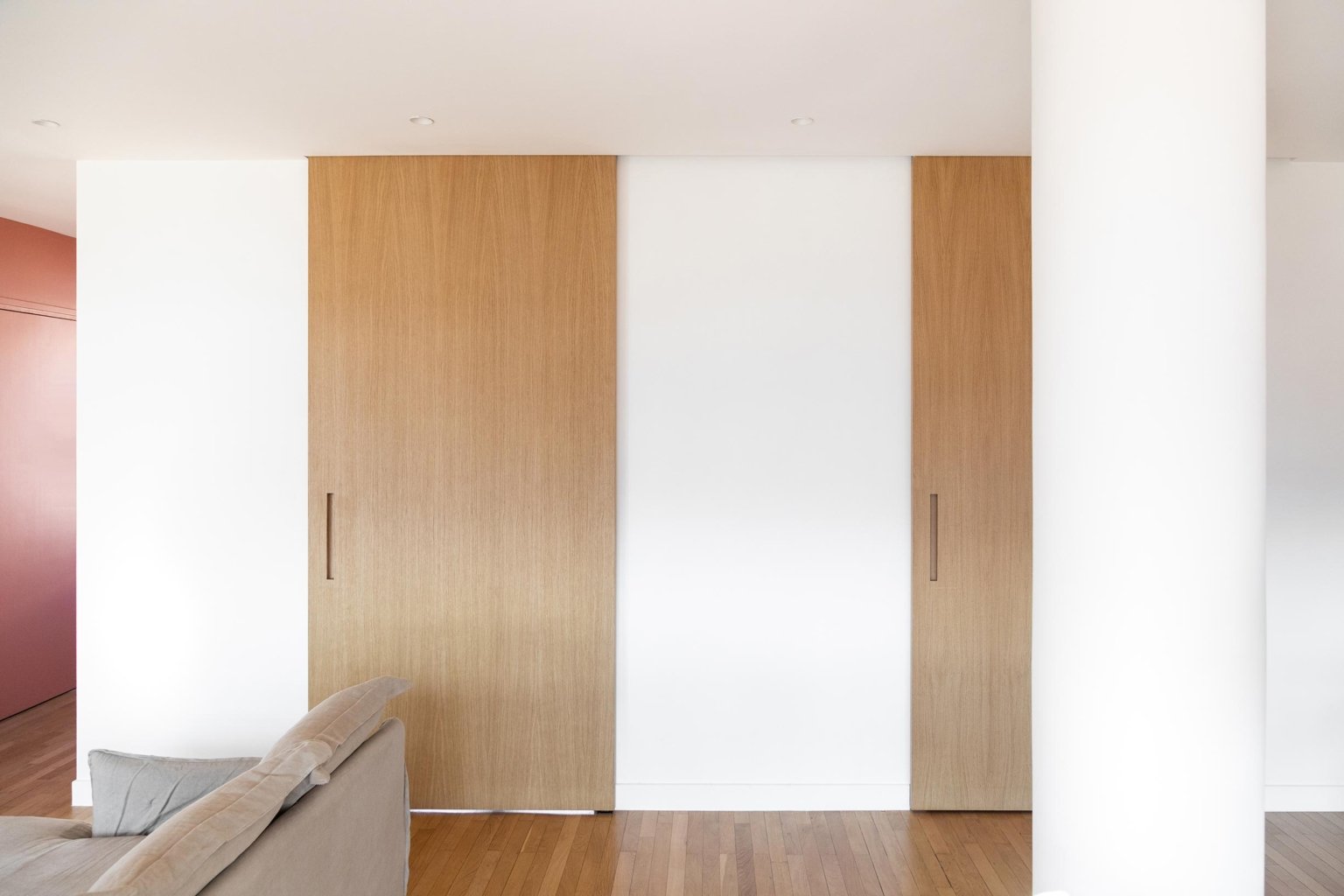 Situé au dernier étage du Building Canebière, œuvre conjointe des architectes F. Pouillon, R. Egger, et J.L. Sourdeau, cet appartement baigné de lumière domine Marseille. Grâce à la structure poteaux-poutres, le volume est entièrement réécrit sur la trame des menuiseries ; rythmées par des brise-soleil en béton. Les grandes portes en chêne et le parquet d’origine réchauffent de concert la pièce de vie. Des lignes claires et des tons doux soulignent la grande sérénité du lieu. Fernand Pouillon prônait la qualité de vie des habitants, l’artisanat et l’insertion dans le paysage. C’est dans cette continuité que s’inscrit cette rénovation.
