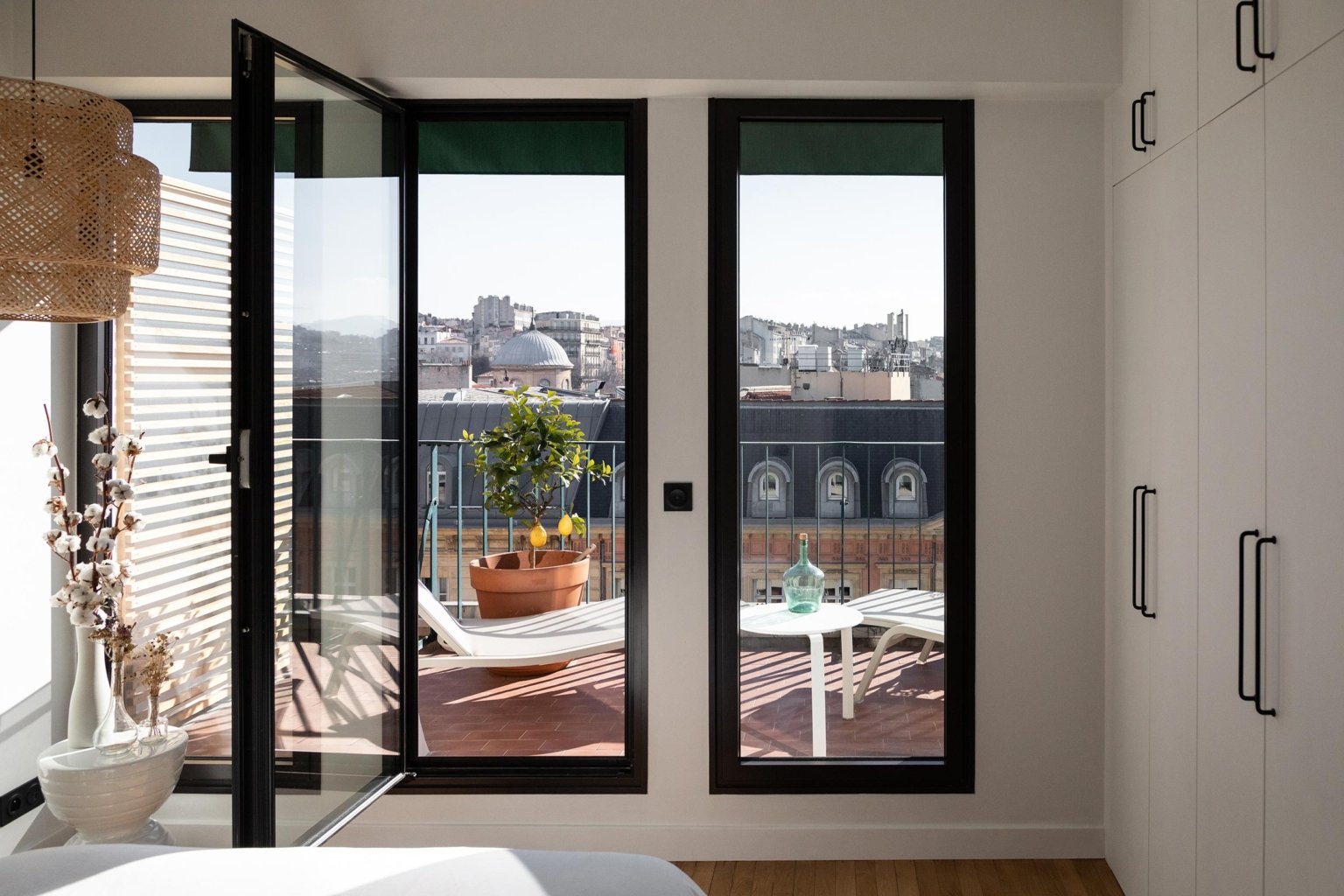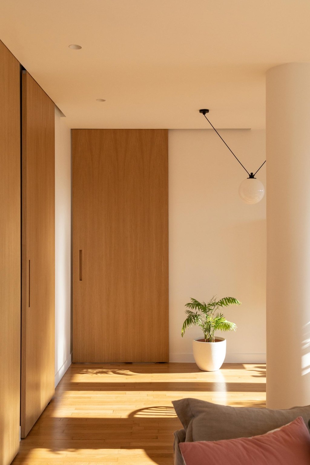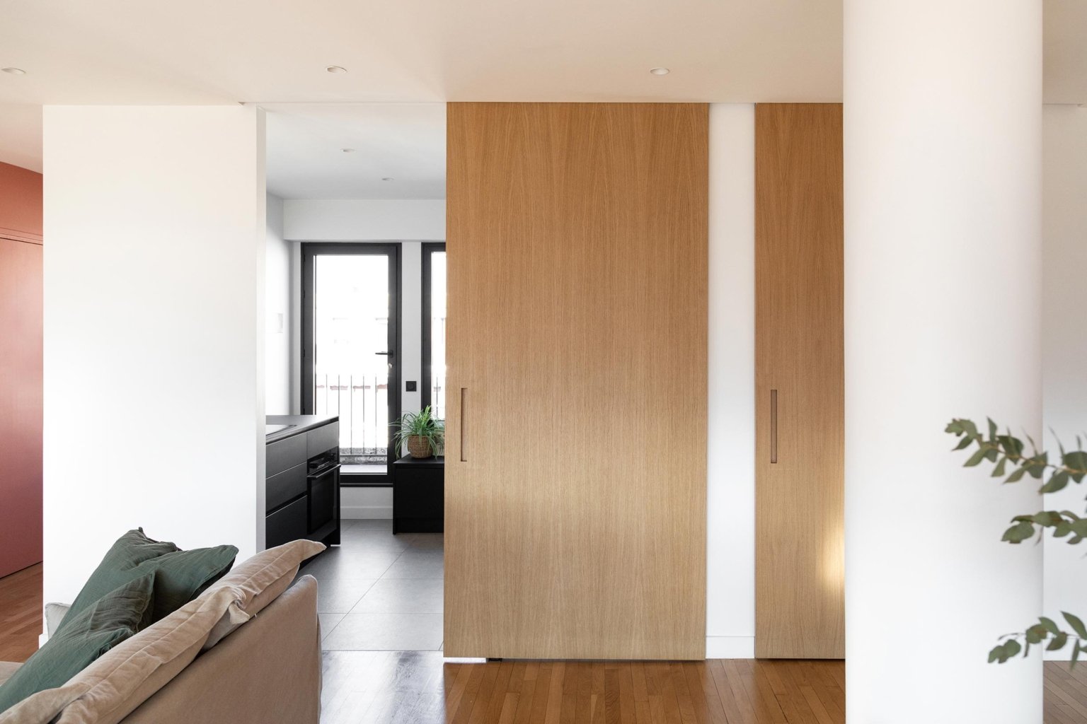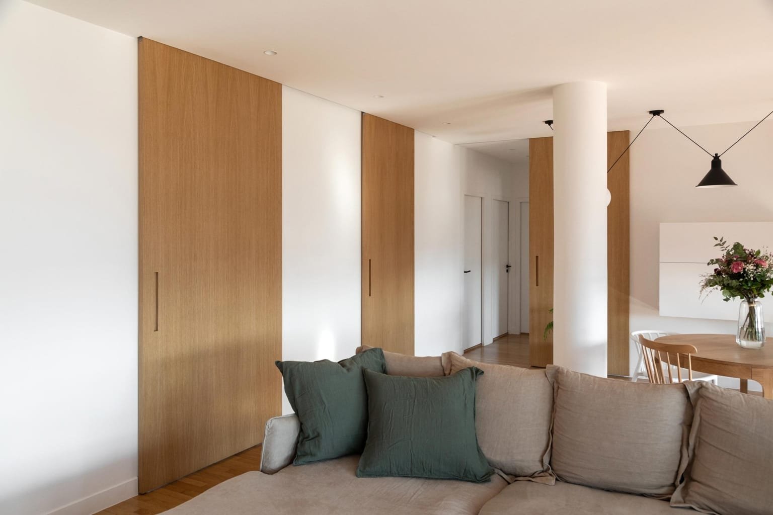 Situé au dernier étage du Building Canebière, œuvre conjointe des architectes F. Pouillon, R. Egger, et J.L. Sourdeau, cet appartement baigné de lumière domine Marseille. Grâce à la structure poteaux-poutres, le volume est entièrement réécrit sur la trame des menuiseries ; rythmées par des brise-soleil en béton. Les grandes portes en chêne et le parquet d’origine réchauffent de concert la pièce de vie. Des lignes claires et des tons doux soulignent la grande sérénité du lieu. Fernand Pouillon prônait la qualité de vie des habitants, l’artisanat et l’insertion dans le paysage. C’est dans cette continuité que s’inscrit cette rénovation.