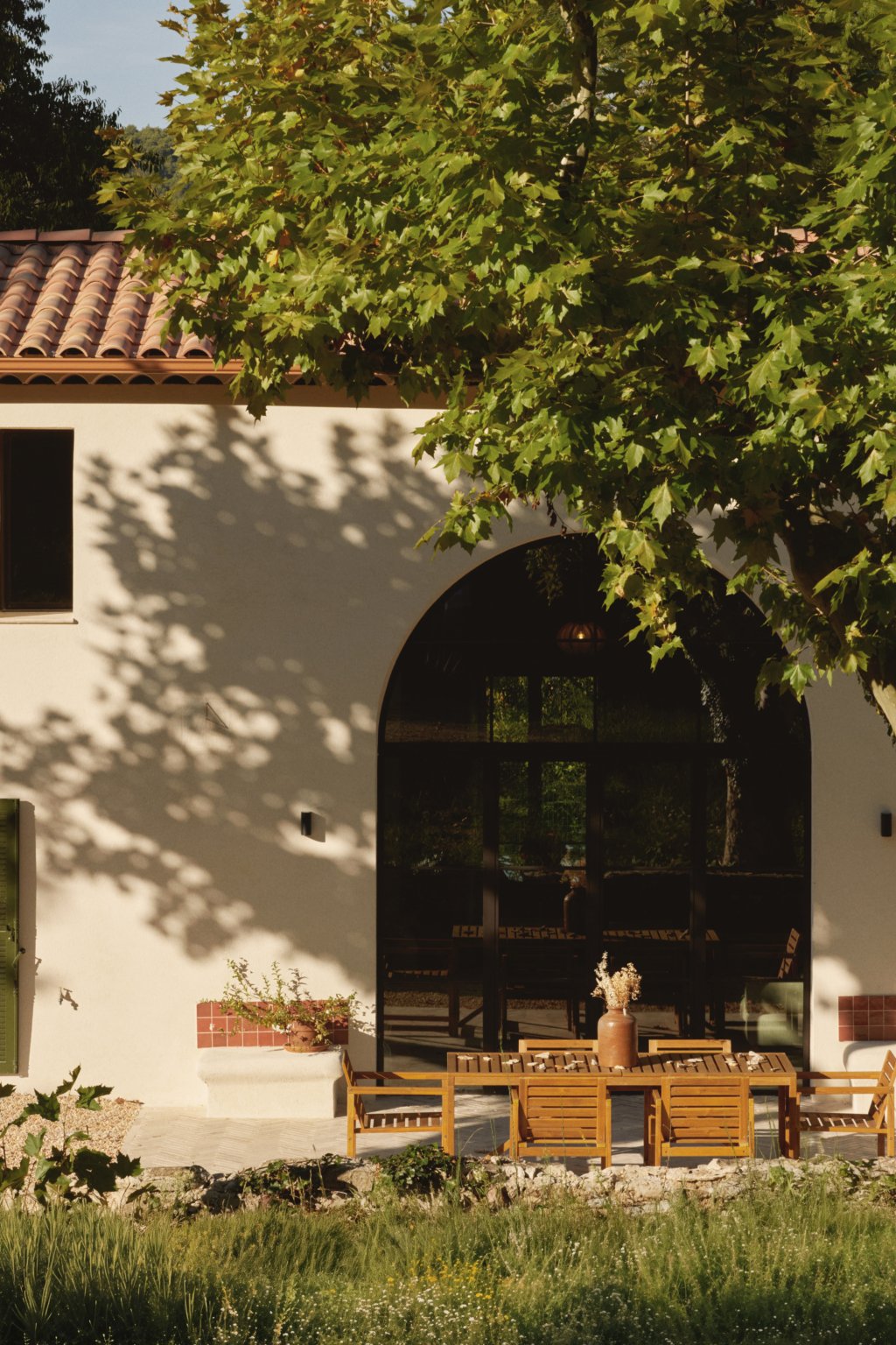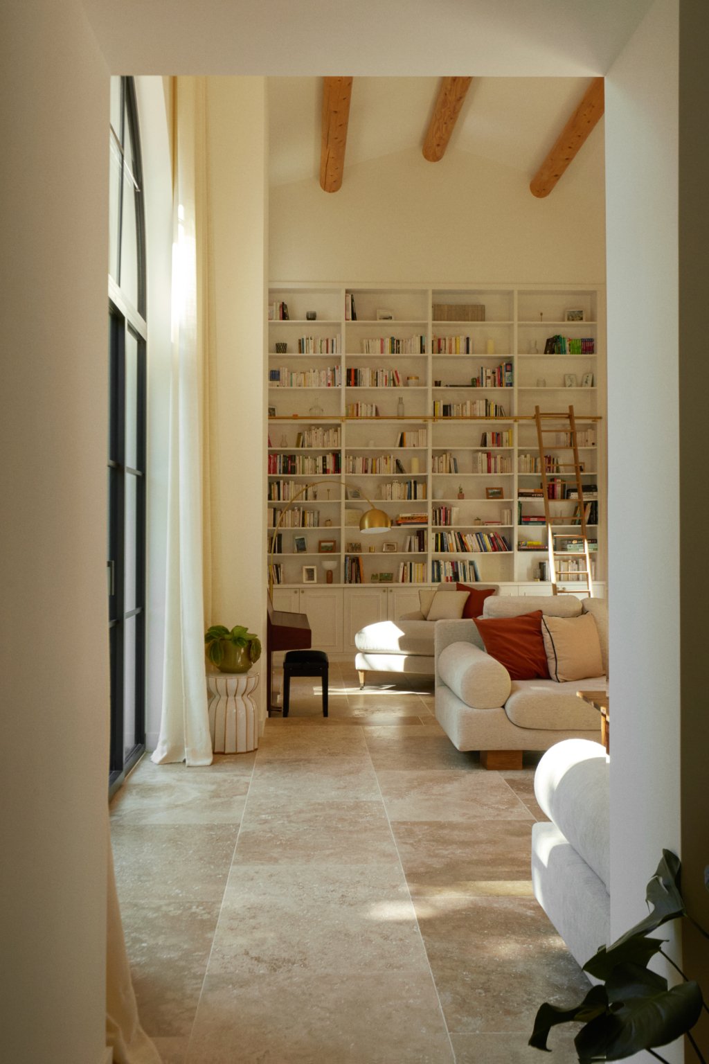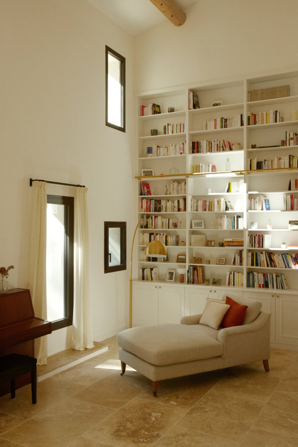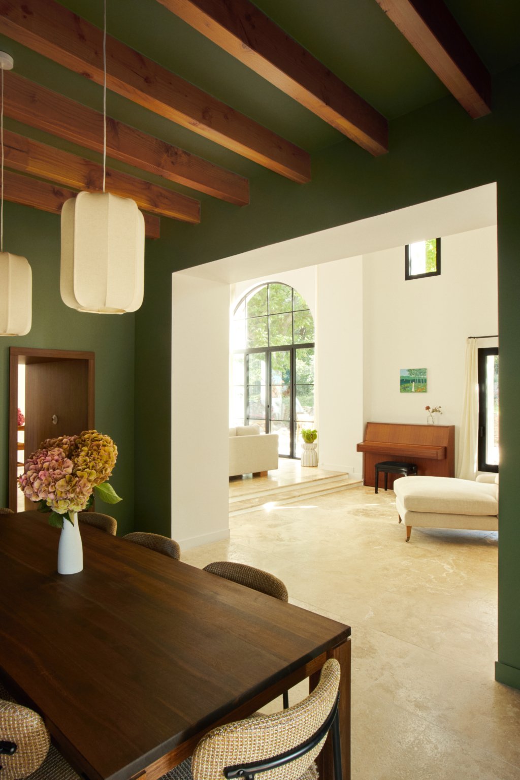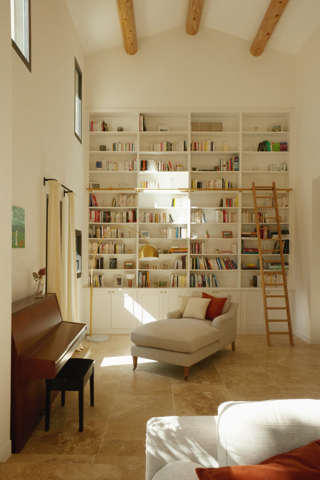 Au sud, une grande baie cintrée signe l’intervention et offre un lien constant avec la nature environnante. À l’Ouest, les espaces de vie sont généreux — salon, cuisine, bibliothèque, salle à manger. À l’Est, les espaces nuit offrent charme, authenticité et intimité avec une suite parentale au rez-de-chaussée ; trois chambres à l’étage et leur salle de bain sur un niveau intermédiaire. Un ancien corps de ferme devenu une grande maison de famille.