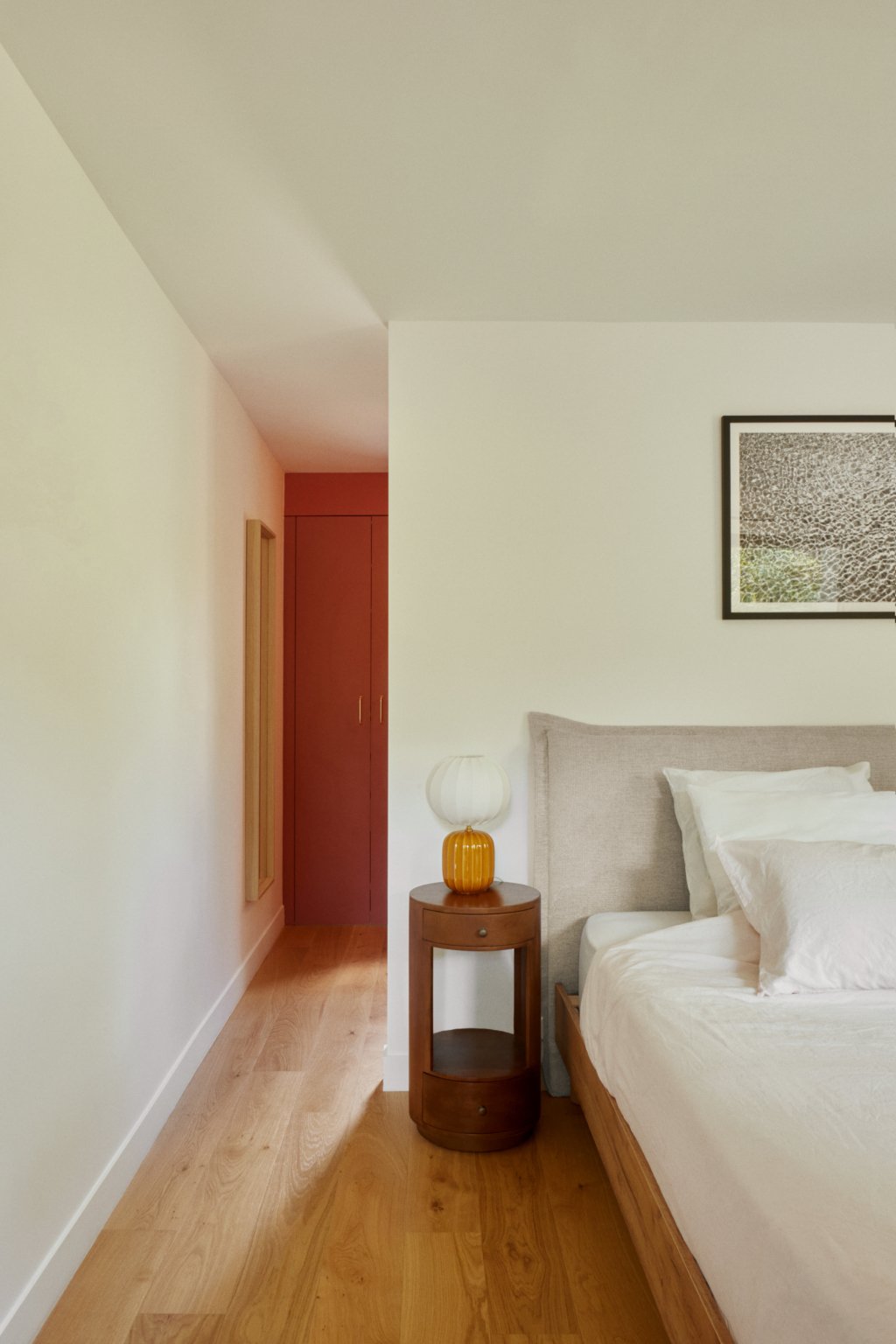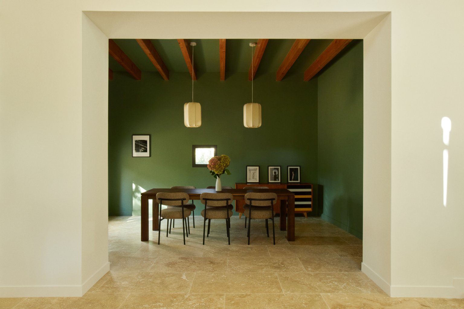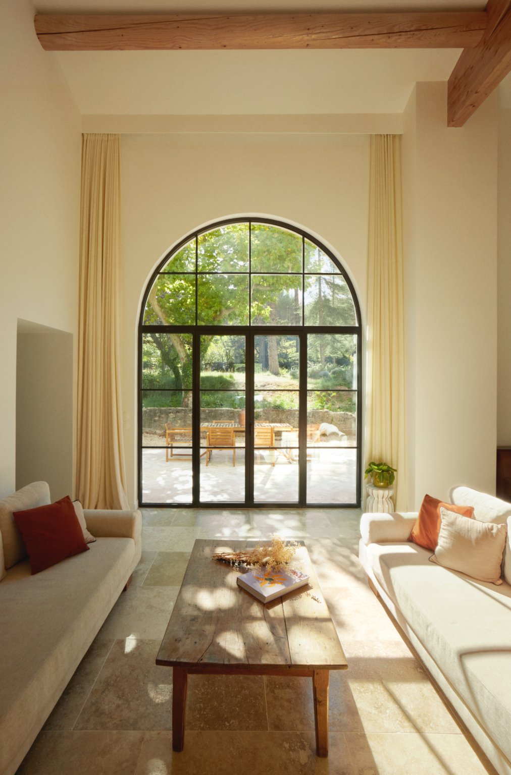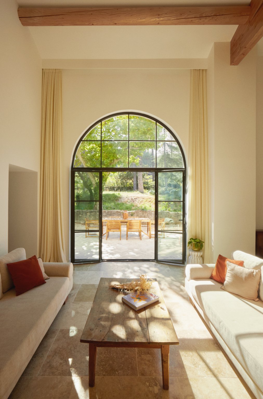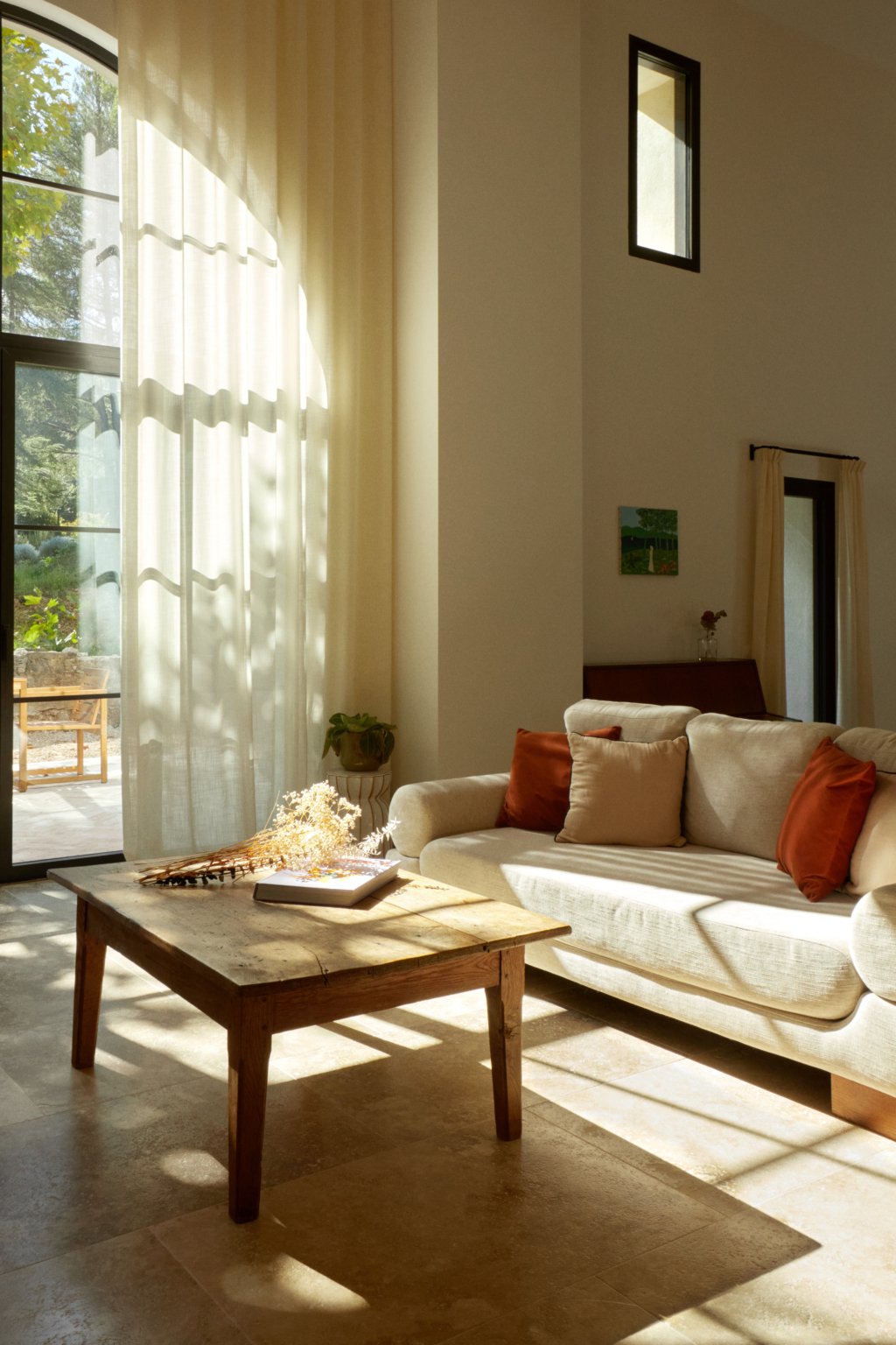 Au sud, une grande baie cintrée signe l’intervention et offre un lien constant avec la nature environnante. À l’Ouest, les espaces de vie sont généreux — salon, cuisine, bibliothèque, salle à manger. À l’Est, les espaces nuit offrent charme, authenticité et intimité avec une suite parentale au rez-de-chaussée ; trois chambres à l’étage et leur salle de bain sur un niveau intermédiaire. Un ancien corps de ferme devenu une grande maison de famille.