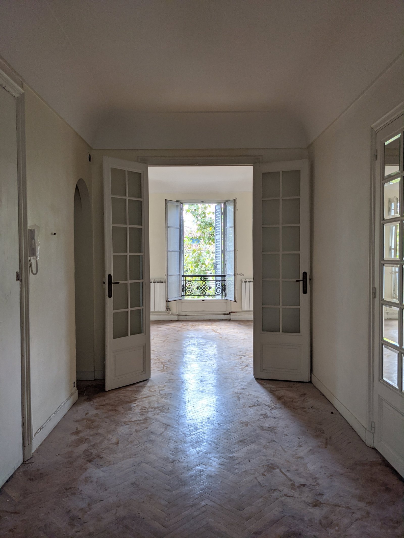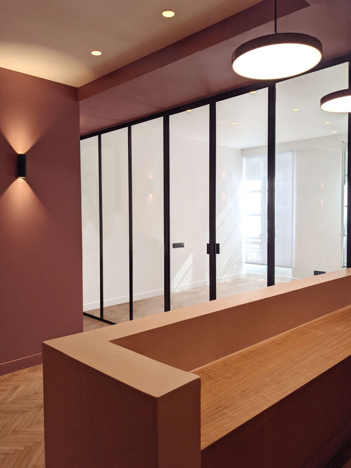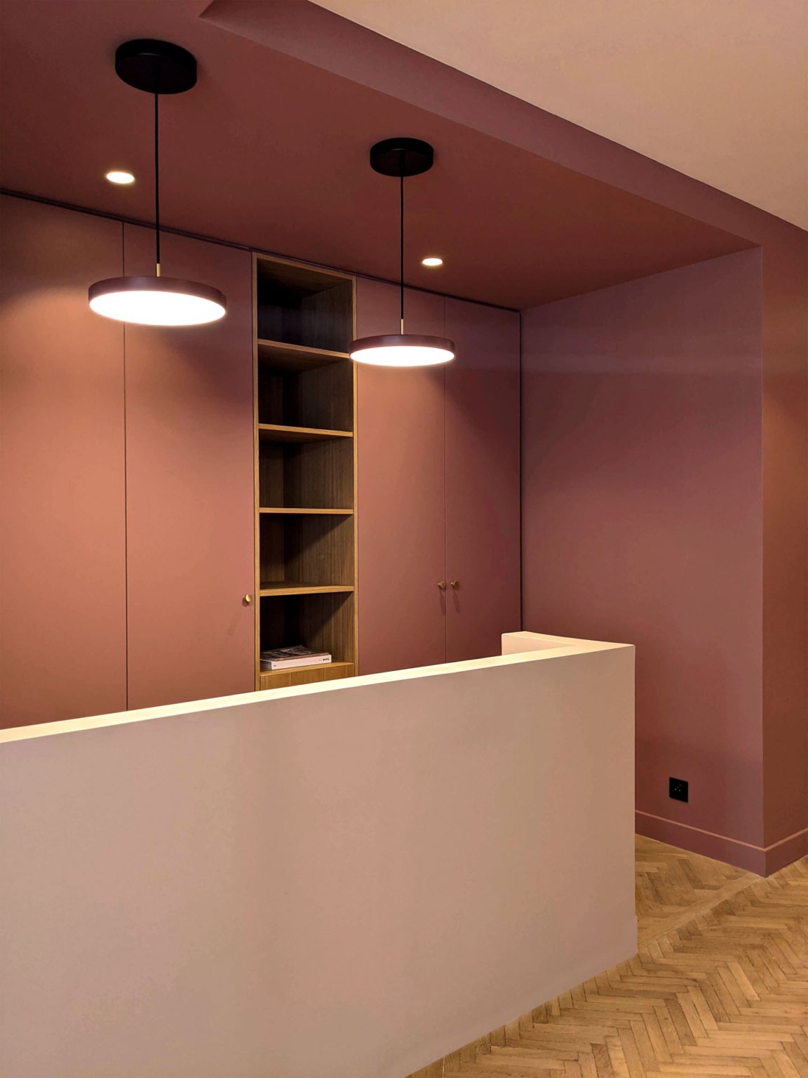 Cet appartement traditionnel marseillais niché dans un immeuble dit « trois fenêtres » de la place Félix Barret s’est offert une rénovation complète comprenant des travaux structurels importants. Aujourd’hui, il accueille un cabinet d’avocats confortable et élégant. Le cabinet a été conçu pour se transformer en logement puisqu’il dispose d’une cuisine, d’une salle de bain, d’un dressing et l’un des bureaux dissimule un grand lit escamotable dans sa bibliothèque. Le cœur du cabinet, peint dans une teinte profonde et intense, confère une ambiance de caractère qui se propage dans toutes les pièces baignées de lumière naturelle.