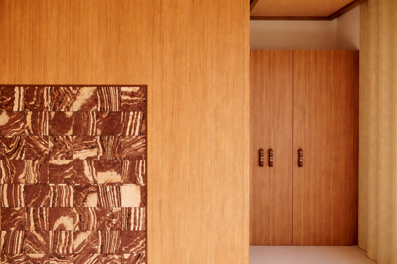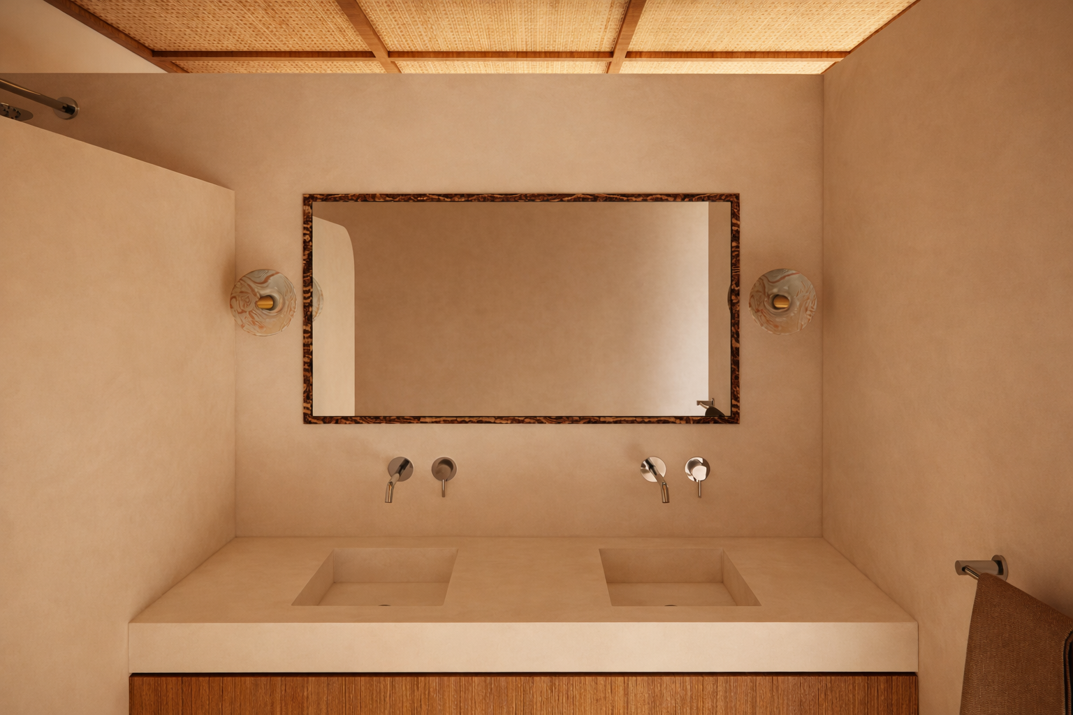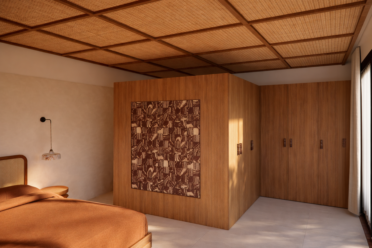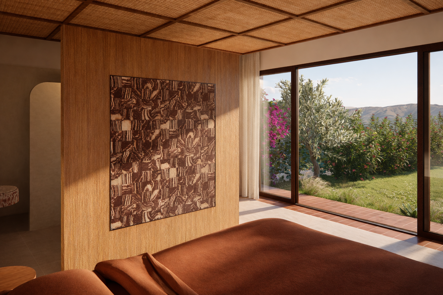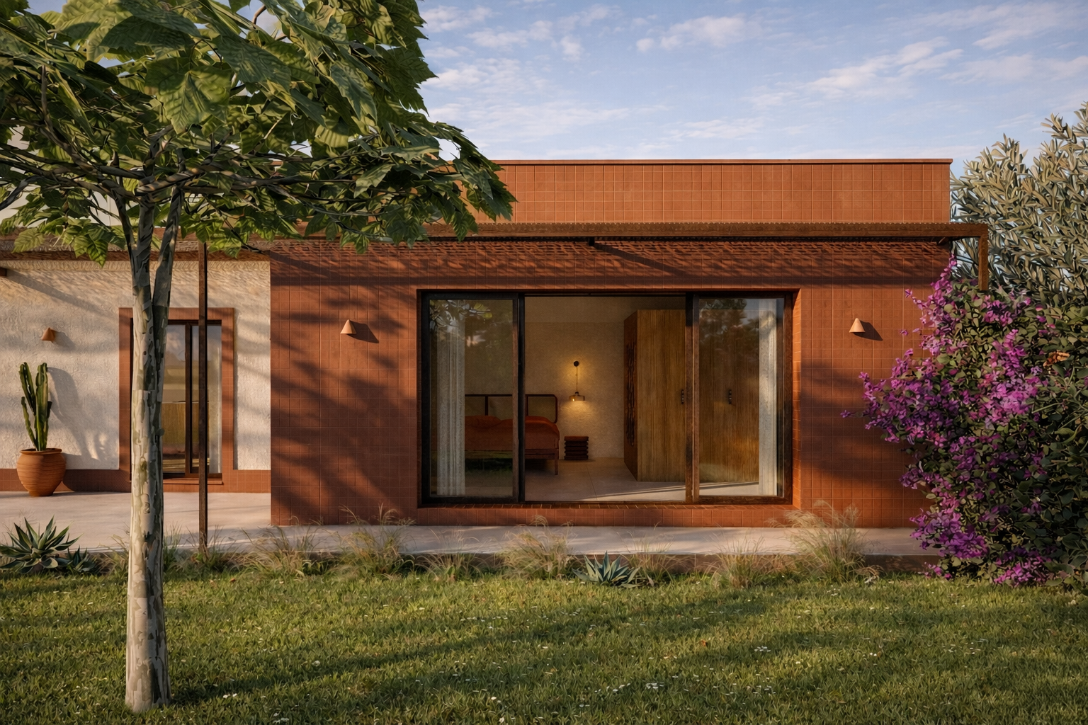 Le projet développe une matérialité chaleureuse et naturelle : métal brun chaud, terre cuite, béton ciré, bois vernis et fibres naturelles, en résonance avec le paysage provençal, qui inscrit la maison dans une continuité sensible entre architecture et territoire.